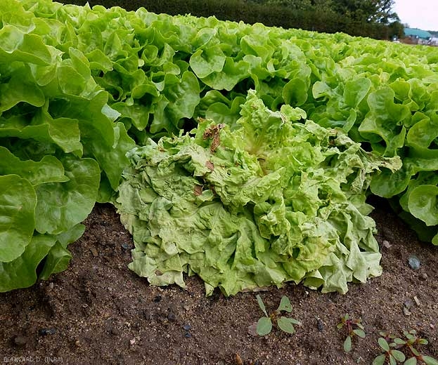 The outer leaves of this salad wilt due to the invasion of the petioles and the main veins by the fungus.  <b> <i> Sclerotinia sclerotiorum </i> </b> ("<i> Sclerotinia </i> drop")
