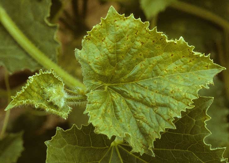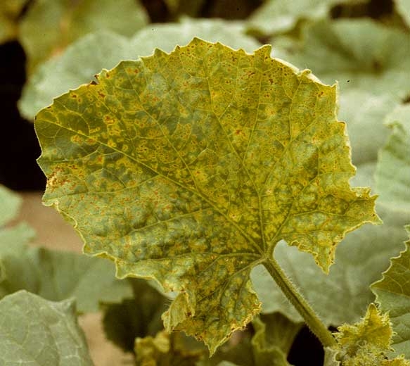 Several chlorotic lesions dot this leaf, mainly the portion near the petiole.  <b> Melon screen virus </b> (<i> Melon necrotic spot virus </i>, MNSV)
