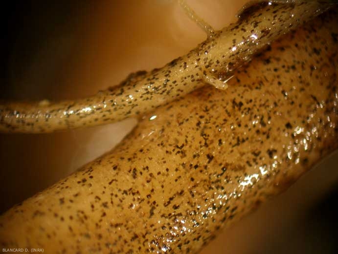 Many pseudo-microsclerotes are arranged in a "mosaic" on this root colonized by <i> <b> Phomopsis sclerotioïdes </b> </i>.  (black root rot)