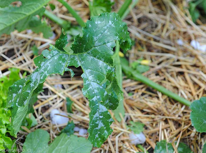 Détail des larges lésions visibles sur feuille de courgette. <b>Dégâts de grêle</b>.