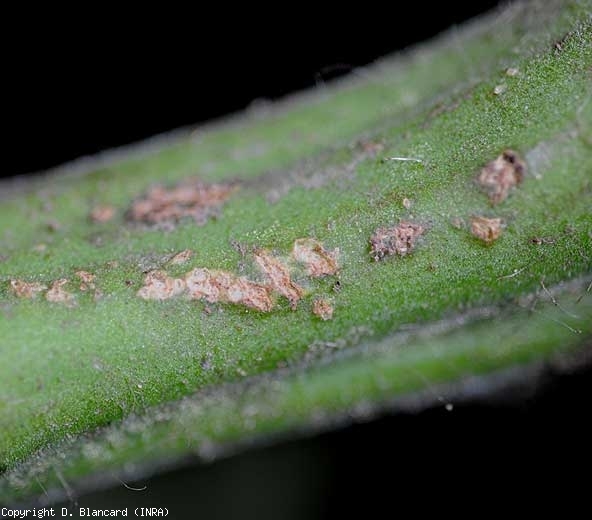 Tiny beige canker lesions are visible on this stem.  <b> <i> Clavibacter michiganensis </i> subsp.  <i>michiganensis</i> </b> (bacterial canker)