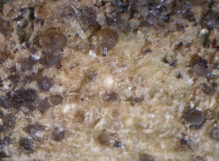 Plusieurs pycnides globuleuses plus ou moins matures parsèment les tissus. <b><i>Didymella lycopercisi</i></b> (taches à <i>Didymella</i>, <i>Didymella</i> leaf spot)v