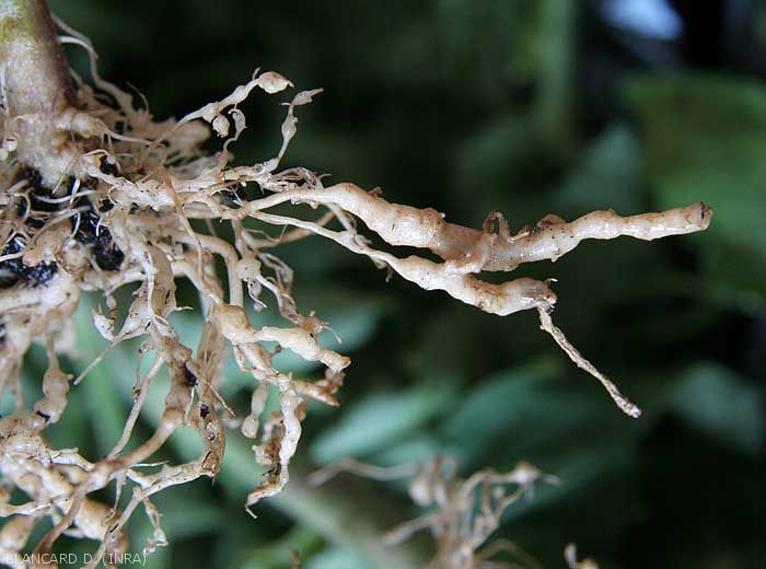 In roots strongly attacked by <b><i>Meloidogyne</i> spp.</b>, it is quite easy to observe with a binocular magnifying glass, and by delicately tearing the tissues of the cortex, hypertrophied females of white color (root-knot nematodes)