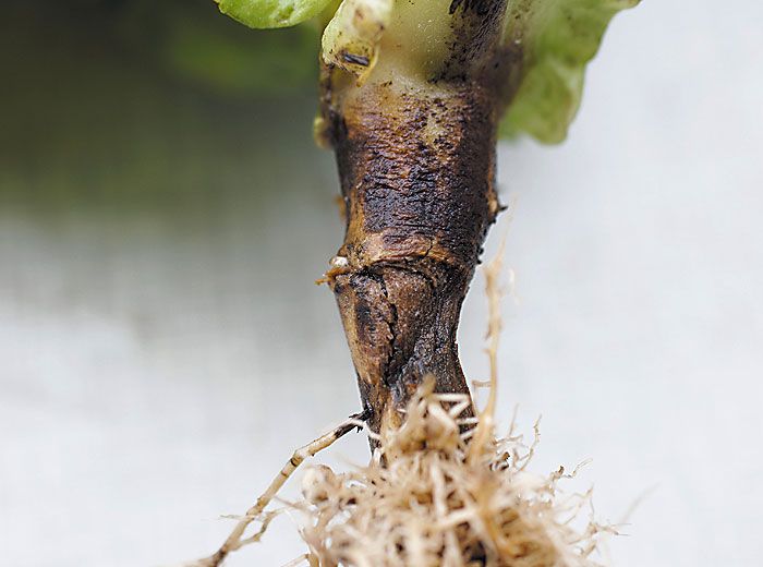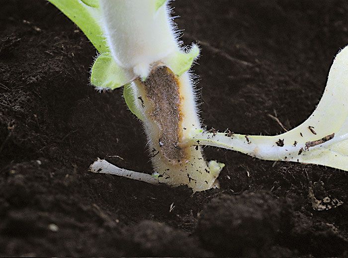 Under certain conditions (heavily contaminated soils, favourable climate ...), the root system of mature plants is invaded externally by the asexual form of T. cucumeris, Rhizoctonia solani. A brown mycelial network is easily distinguished on the surface. Invaded roots turn yellowish to brown, they are superficially corky and many rootlets are decomposed (figure 5).