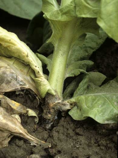 Although often observed on the upper parts of the stem Sclerotinia sclerotiorum is sometimes found close to soil line. It causes moist, dark brown to brown lesions, covered occasionally by a fleecy white felting and white, later to become black sclerotia (figures 1 and 2). If the sclerotia are not present , we suggest you to place samples (altered portions of stems) in a plastic bag with wet paper, ("towel"). In case Sclerotinia sclerotiorum is responsible for lesions observed, it will soon produce mycelium and sclerotia (Figure 3) the presence of which will allow you to identify the pathogen. For further information, see the fact sheet of Sclerotinia sclerotiorum.
