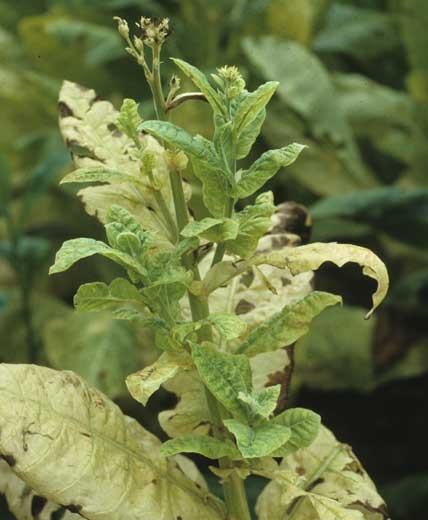 The disease starts as a leaf yellowing, which is first interveinal, occuring most frequently on older leaves or middle leaves and gradually covers the whole plant (figures 1-3). In dark tobacco leaves, veinal and interveinal necrosis occasionally accompany a slight chlorosis of the lamina (figure 4); the observed syndroma may be confused with that caused by certain necrotic strains of potato virus Y (PVY), see the fact sheet.