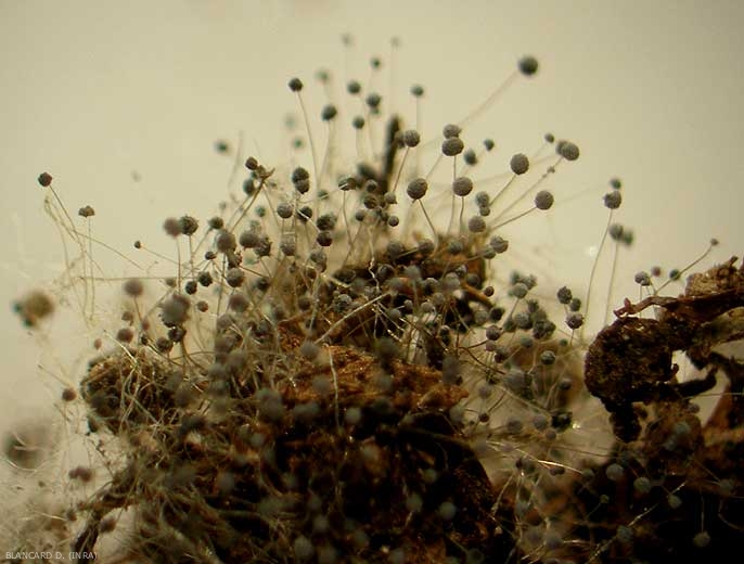 R. stolonifer , which evolves very quickly in the fruits, does not take long to sporulate in the form of an aerial blackish mold (figure 1) formed by numerous sporangiophores at the origin of innumerable black spores in spore vesicles. (figures 2 and 3). These are very present in the air and are dispersed by the wind over long distances, as well as by splashing water and certain insects.