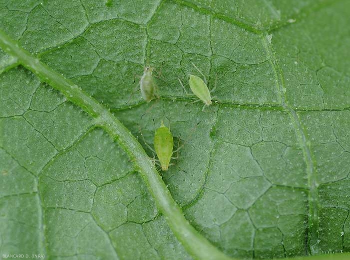 The aphids, subsequent to their nutritional bites are reponsables punctuation chlorotic and deformation of young leaves that have tendency to curl and roughly blister (Figures 1 and 2). Leaves, like fruits (Figures 3 and 4) can be colonized. A reduction in the growth of young shoots, or even plants, can be observed.