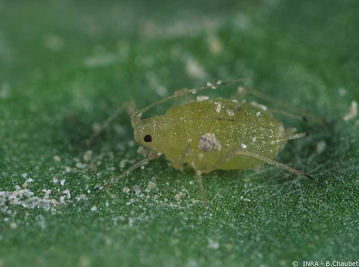 - Myzus persicae (the green peach and potato aphid - photos 1 and 2) favours the lower leaves. It is one of the most dangerous species for the transmission of potato viruses. Some populations of this species are insecticide-resistant.