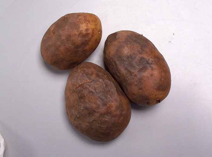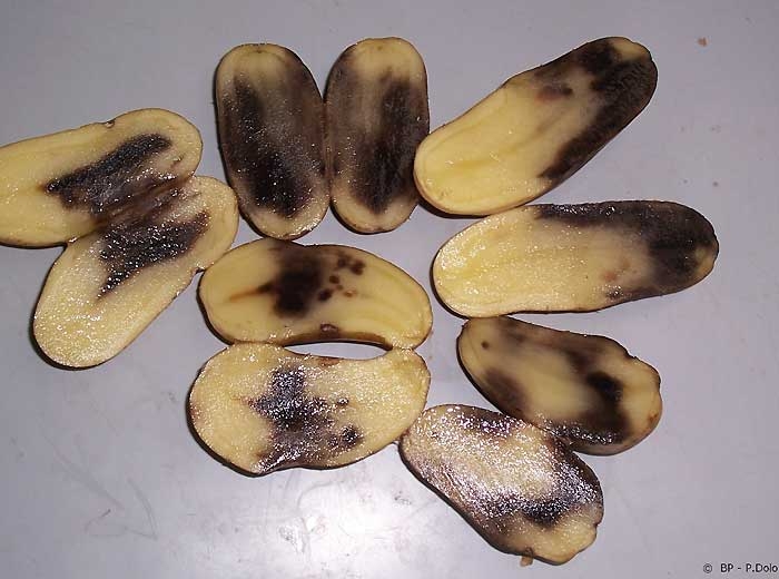 The symptoms appear when the plants are getting warm again after frost. The frozen part of the tuber becomes soft. The inside becomes liquid and blackens. In the case of a partial frost, irregular grey to black spots (photo 3) may be observed in the flesh but more commonly in the outer part of the tuber.