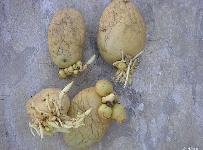 This is the physiological age at which the seed tuber’s growth is at its most vigorous; - phase III during which sprouting slows, is characterised by the formation of numerous very elongated sprouts (spindly sprouts, photos 5 to 7). At the end of this phase (fully incubated seed tuber), during which the development of numerous small sprouts per eye may also be observed (photo 8), premature daughter tuber formation can occur. This characterises the final stage of the physiological ageing of seed potatoes (photos 9 to 13).