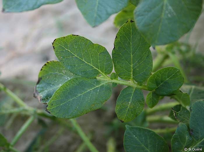 - Symptoms of deficiency: the deficiency is initially manifested by an elongation of the leaflets, sometimes accompanied by slight deformation of the leaf margins, followed by brownish spots and a dull, dark green appearance of the leaf blade (photos 1 and 2). Severe deficiencies can lead to stunted plants with thin stems and smaller upwards curling leaves.