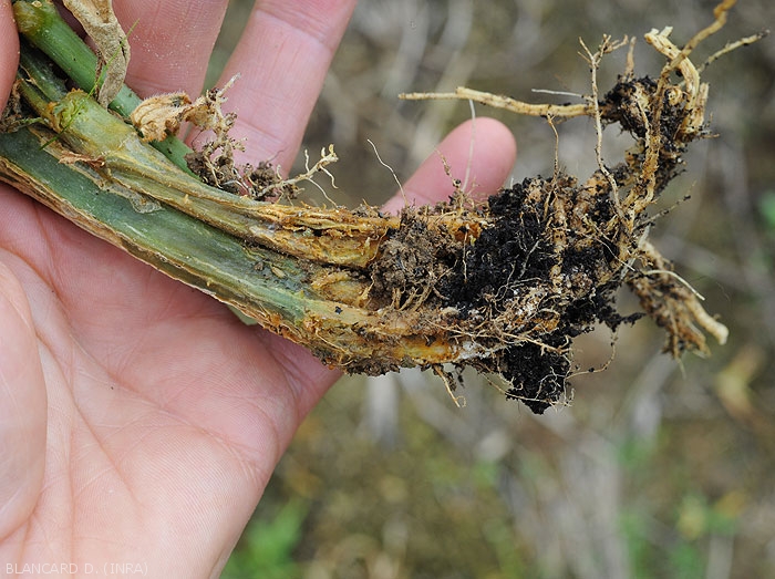 - Browning and root rot in soil and above ground ( root rot ) (figures 1 to 5) sometimes localized at the end of the roots. Browning, decomposition and disappearance of rootlets and small diameter roots. The cortex of the main roots and taproot also ends up rotting more or less locally. The vascular tissues facing the altered areas end up turning brown.