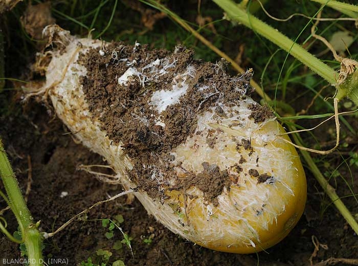 Sclerotium rolfsii attacks all organs of Cucurbitaceae located in or near the soil, whether the plants are very young (in nurseries) or adult in the field.