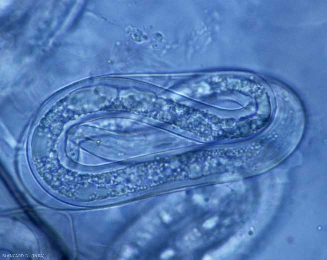 • Parasitism : The larvae penetrate the roots and migrate to the vessels through the cortex, between the cells. Induce galls surrounding large pear-shaped females which produce numerous eggs (300 to 3000, between 400 and 500 on average).