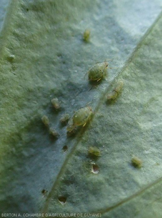 - Larvae and adults often present on the underside of the blade, feeding through their rostrum. The excess sugar contained in the sap is released in the form of honeydew.