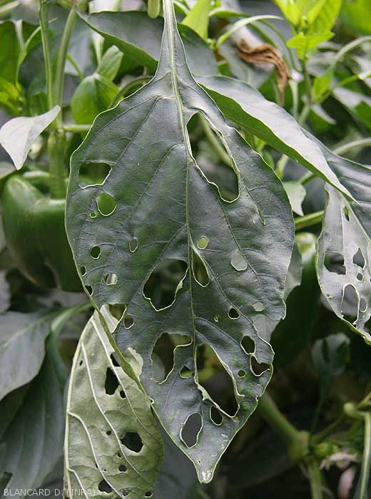 - Consumption of tips and leaves and leaflets by the larvae, especially the older ones. They form large holes located on the leaf blade or at its periphery, sometimes leaving behind only the main veins and thus greatly reducing photosynthesis.