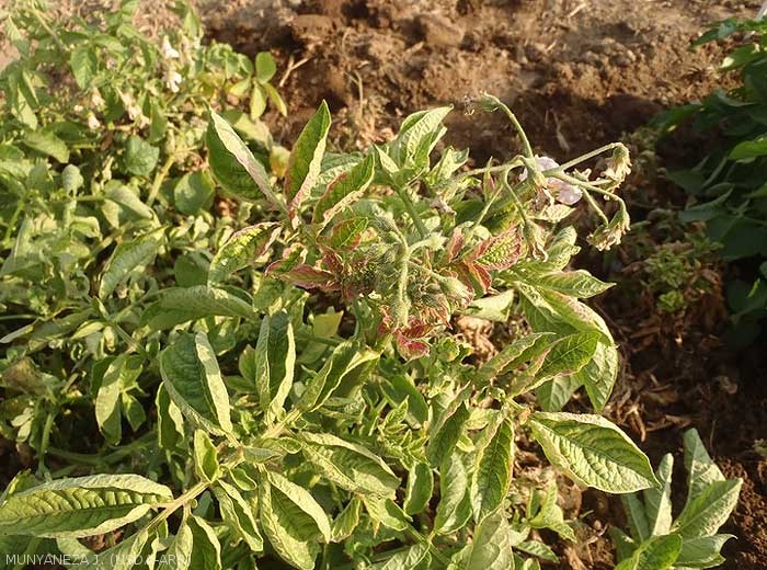 During crop season, infected plants are stunted and have an erected port. The leaves, sometimes curled, show chlorotic areas with some mottling and a purplish color, especially at the level of the apical area (photo 1). The stems may have "zig zag" patterns, and with short and thickened nodes and aerial tubers. Heavily infected plants have foliage that looks burnt