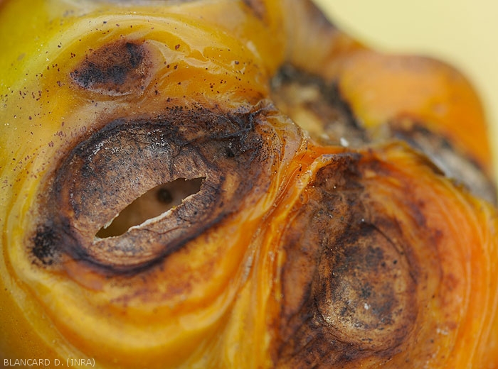 Small, moist, dull circular lesions, light brown, progressively developing on fruit. As they extend, they become concave and their center gradually browns (figures 1 to 3)