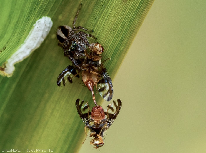 Certain natural auxiliaries (figures 11 and 12) can contribute to limiting the populations of N. cyanescens on reservoir plants or in untreated plots. A native larval parasitoid species, Psyttalia insignipennis (Granger) (= Austroopius ) was thus observed in Mayotte, with a reduced rate of parasitism (8%).