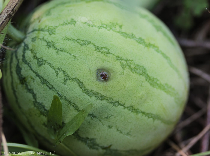 • Thanks to their ovipositor, they lay their eggs in the epidermis of the fruits, which causes the appearance of areas of dark green to blackish bites which soften and become hollow (figures 1 to 3, and 5).