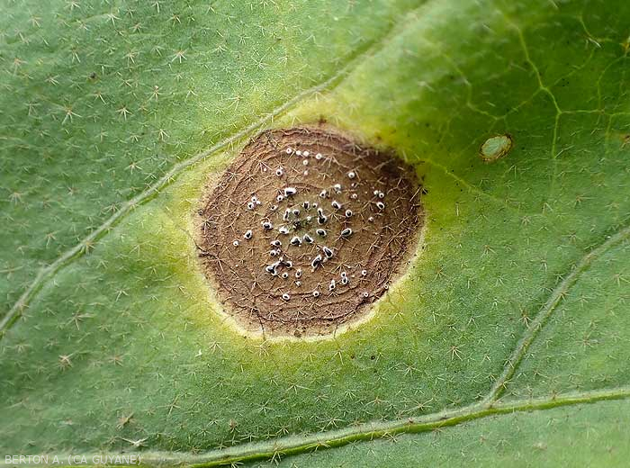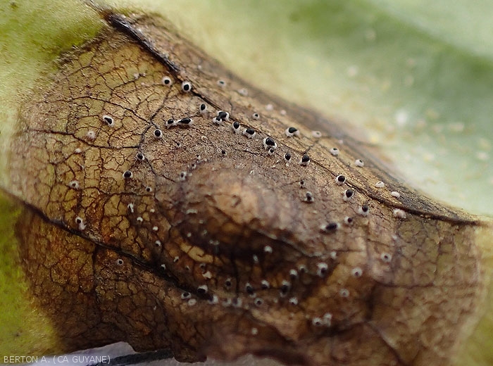 Signs : presence of grayish to black spore pads: sporodochia (figure 4). These structures are made up of numerous phialides which form cylindrical, hyaline to slightly olive conidia at their end.