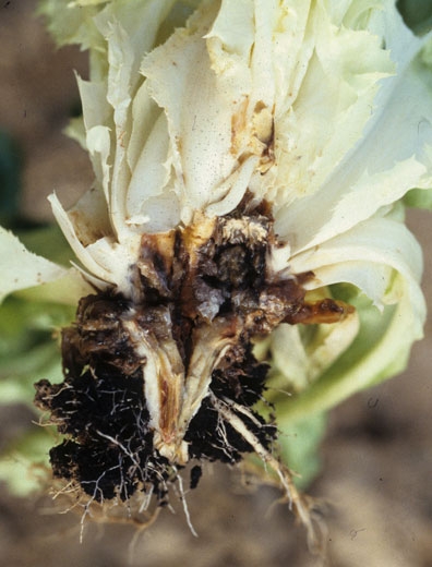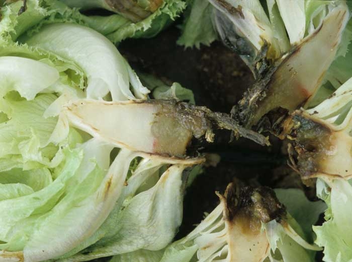 A few dark spots are sometimes visible on the leaves. Subsequently, a moist, viscous, dark brown to black rot begins on a few leaves and then spreads over the entire apple (" slime head ") (figure 5). Eventually, affected salads can completely liquefy (Figure 6). No particular structure is observed on the tissues, unlike the parasitic fungi responsible for wilting and leaf rots ( Botrytis cinerea , Sclerotinia spp.).