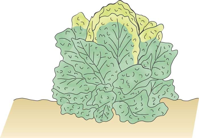 chlorose internervaire des jeunes feuilles, puis des plus âgées dont les nervures principales restent assez vertes et contrastent avec les tissus internervaires. A terme, l'ensemble du limbe peut se décolorer. Les salades ont une apparence vert pâle et leur