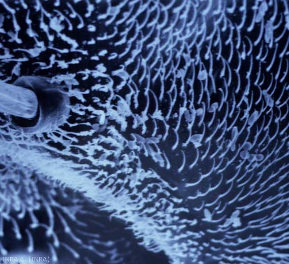Vection by adult fruit flies can take place in two ways: either by the presence of propagules on the surface of the insect's body, or possibly internally in their crop. Indeed, observations by scanning electron microscopy (Figures 5 and 6) make it possible to observe the presence of yeast cells on certain parts of the insect's body, such as the thorax and the legs ( K. apiculata is systematically detected and C. stellata is very common). However, these propagules are rarer on the head, abdomen or wings. An inventory of the mycoflora of the crop of these insects reveals 2 dominant species: K. apiculata and C. stellata , but also more occasionally P. membranifaciens , M. pulcherrima , Candida krusei , and various fungi such as Botrytis cinerea or belonging to the genera Rhizopus , Penicillium . Let us add that the cells of the yeasts in particular could be expelled alive after the intestinal transit.