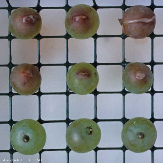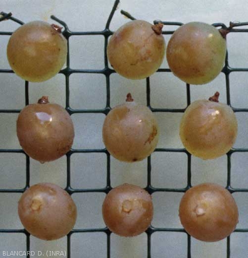 This berry affection manifests itself after veraison, especially on ripe berries rich in sugars. These conditions promote the multiplication of yeasts and bacteria which are present in large quantities on the berries. They penetrate the latter near the peduncle attachment or via various injuries: bird pecks *, insect damage (figure 1) and hail, micro or macro-bursts of berry growth occurring as a result of hydric stress .... Subsequently, they multiply rapidly in the pulp and acidify it in a few hours. Symptoms are already visible 2 to 3 days after the contaminations (figures 2 and 3).