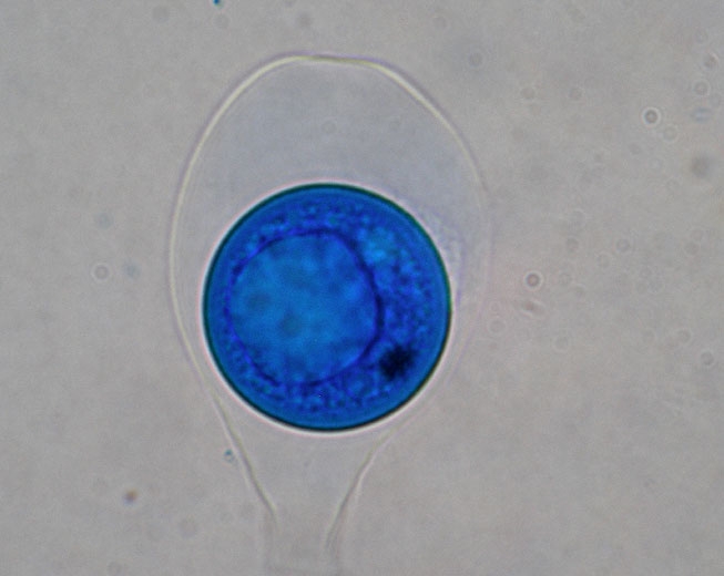 M. cannonballus forms spherical and black perithecia (measuring between 40 and 50 µm in diameter) in root tissues (Figures 1 to 4 and 7), this late in the season after harvest or plant death. At maturity, these structures contain numerous asci each containing a spherical ascospore (Figures 4 to 6, 8 and 9). Several hundred thousand ascospores could be produced and released from a root system of a diseased melon plant. These ascospores are distributed vertically and horizontally in cultivated soils in a uniform manner. Their number is still higher in the superficial soil stratum.