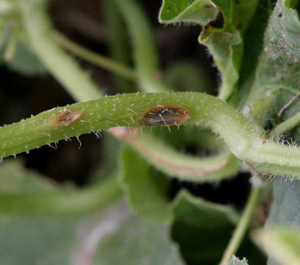 on the stems and petioles Elongated lesions develop . They are also damp at first and gradually turn brown. Their size fluctuates depending on the species and climatic conditions. Note that a viscous substance sometimes beads infected tissue. On the melon stalks (Figures 8 and 10), small beige depressed cankers are observed, in the shape of a “lip”. Over time, these cankers become elliptical, light brown, and a dark green down covers them in their central part.