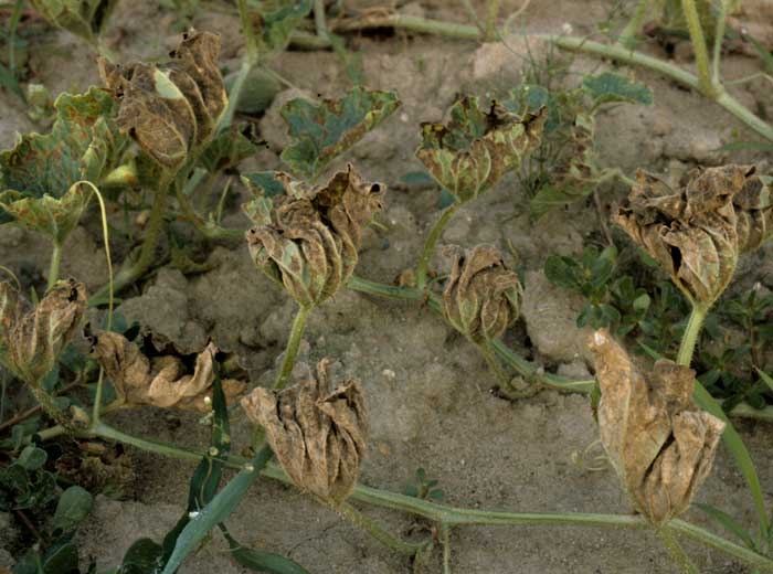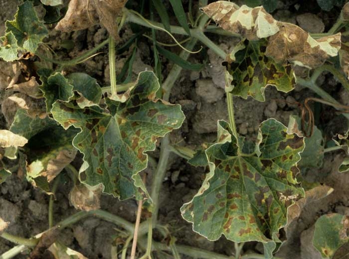 On melon, the spots leaf are first wet (Figures 1 to 3), then they turn yellow (Figures 2 and 4), turn brown, and rapidly necrosis (Figures 3 and 5). Ultimately, a chlorotic border surrounds them (Figure 4). These spots are sometimes initiated near the veins which turn brown over a more or less limited portion. During periods of high humidity, affected tissue can break down and fall off.