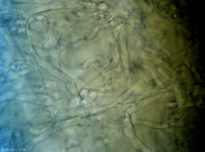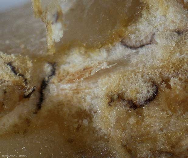 It seems that it settles on the root system through the rootlets that it colonizes before reaching the roots. Its mycelium (figure 7) gradually invades the tissues of the cortex which eventually decompose and disappear as well as the central cylinder.