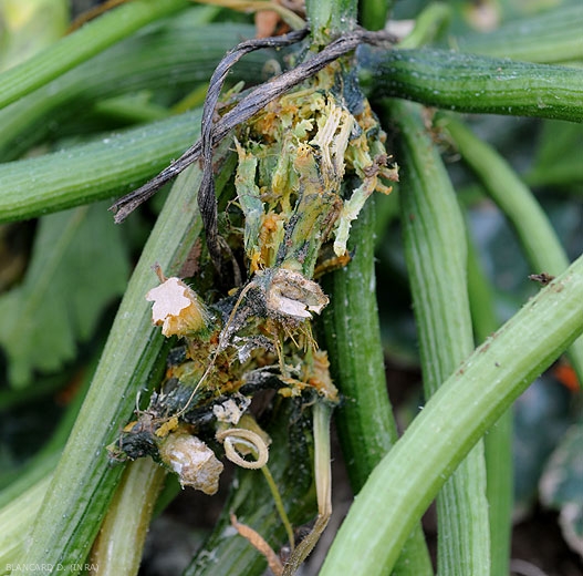 Pectobacterium carotovorum subsp. carotovorum mainly attacks stem the zucchini , and develops particularly inside it. To realize this, it is advisable to make a cross section (figure 1) or longitudinal (figure 2) to see the devastating effects of this bacterium. There are moist, brownish to orange lesions, and numerous cavities associated with local liquefaction of internal tissues. Rot can spread to the outside of the stem, a dark brown to blackish lesion extending and surrounding it over a longer or shorter length. Ultimately, the tissues end up decomposing and liquefying, only the vascular system remains (figure 3).