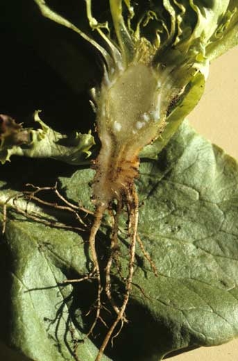 This lettuce, affected by <i> <b> Pythium tracheiphilum </b> </i> ("lettuce stunt"), shows browned vessels.