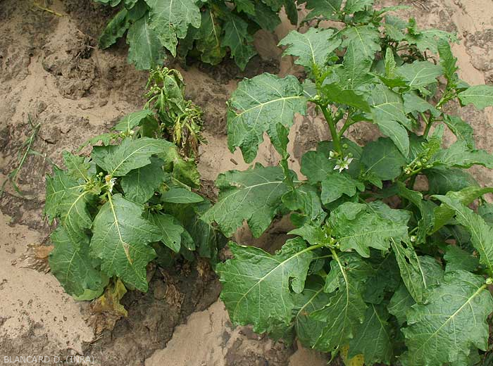 Several lower leaves of this eggplant plant show discoloured, chlorotic or even necrotic sectors of the lower leaf blades.  <b><i>Verticillium dalhiae</i></b> (verticillium wilt, <i>Verticillium</i> wilt)