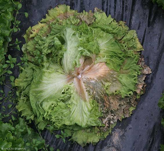 The outer leaves of this salad wilt due to the invasion of the petioles and the main veins by the fungus.  <b> <i> Sclerotinia sclerotiorum </i> </b> ("<i> Sclerotinia </i> drop")
