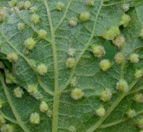 Detail of Phylloxera galls visible on the underside of the leaf blade.  <b> <i> Daktulosphaira vitifoliae </i> </b>