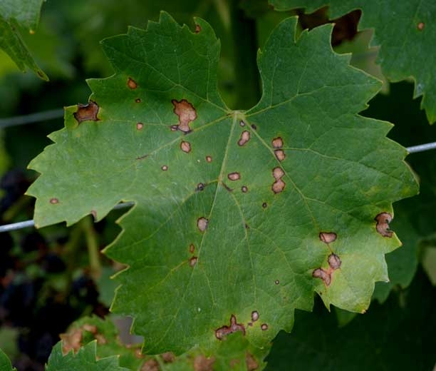 Necrotic spots of various sizes invade these vine leaves, eventually leading to their death.  <i> Guignardia bidwellii </i> (<b> black rot </b>)