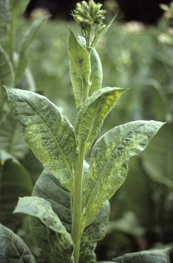 A few yellow spots can be observed on lower leaves of this Burley tobacco. Cucumber mosaic virus (CMV)
