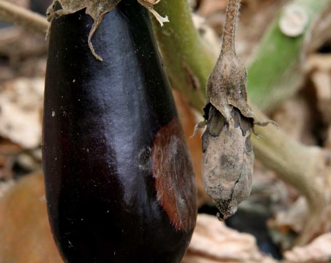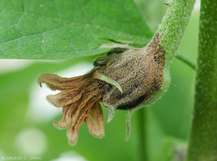 <i><b>Botrytis cinerea</b></i> has colonized the sepals of this senescent eggplant flower, it won't be long before it invades the peduncle and perhaps gains the stem. (grey mold)
