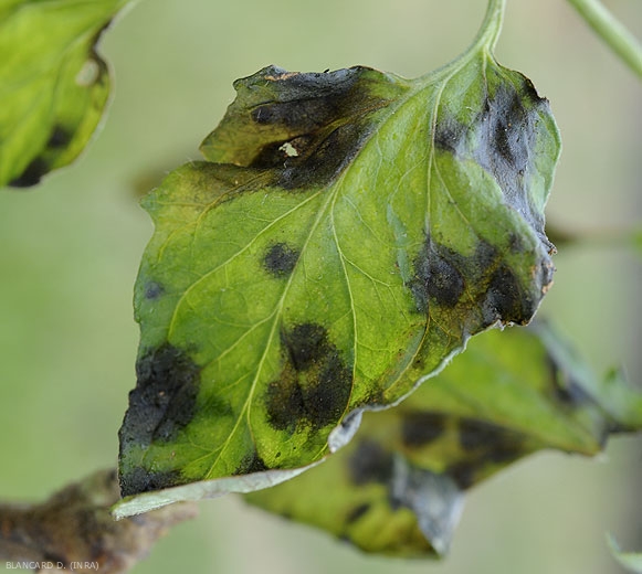 The spots, initially brown, have taken on a beigeish tint, while the veins are blackish.  <b> <i> Didymella lycopercisi </i> </b> (<i> Didymella </i>, <i> Didymella </i> leaf spot)