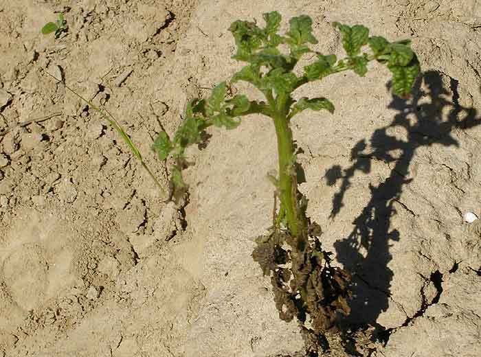 Streak with necrosis and drying of the base of leaves, stunting and leaf deformations on young potato plants infected with <i> <b> Potato Virus Y </i> </b>.