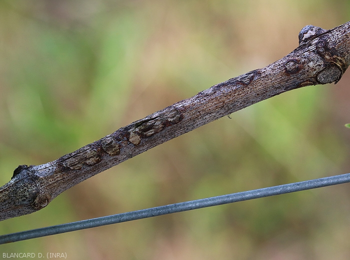 Appearance of old lesions present on the woods formed last year. It is in particular on the latter that sclerotia are found from which the primary inoculum is formed. <i> <b> Elsinoë ampelina </b> </i>