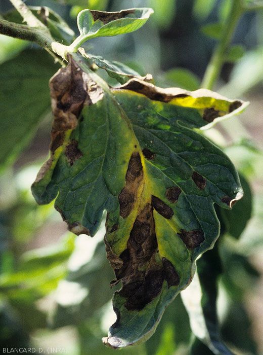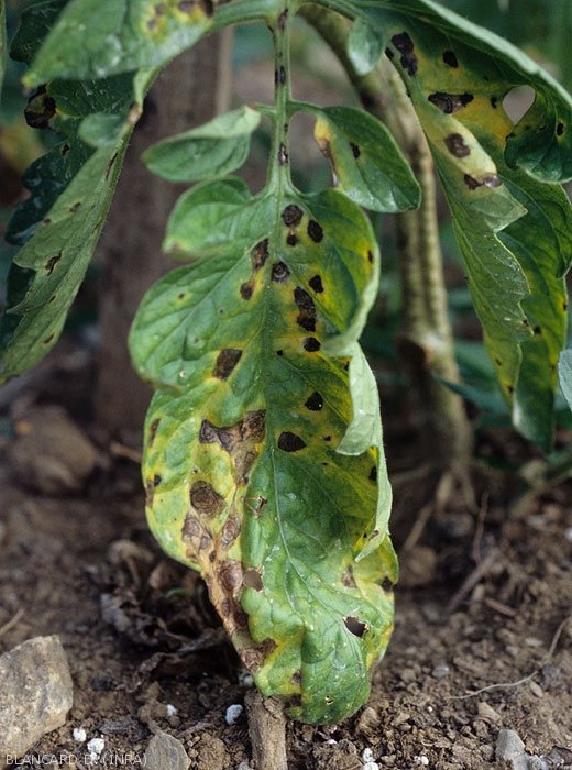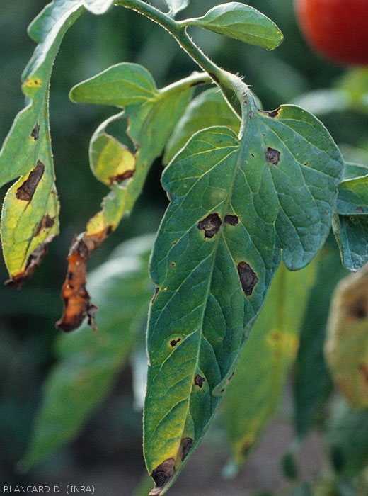 Older angular and necrotic spots, a more or less bright yellow halo surrounds them (due to the effects of a toxin) <i><b>Alternaria tomatophila</b></i> (alternaria, early blight)