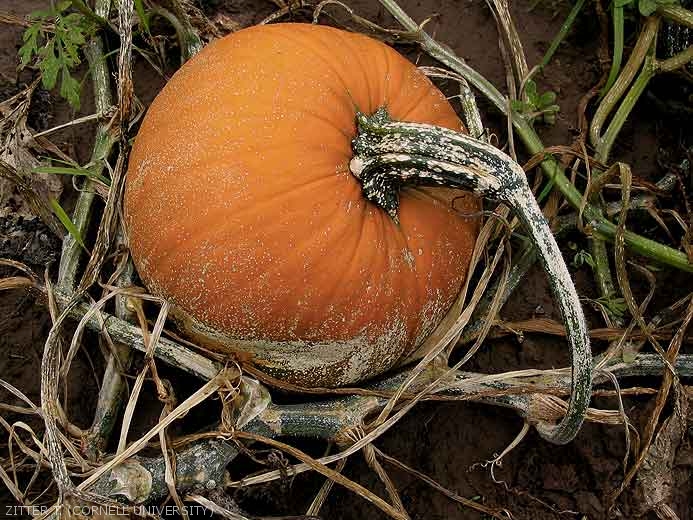 Extensive beigeish superficial lesion on stem and petioles of zucchini.  Note the presence of tiny beigeish spots riddled with the blades of certain leaves.  <b><i>Monographella cucumerina</b></i> (plectosporiosis)