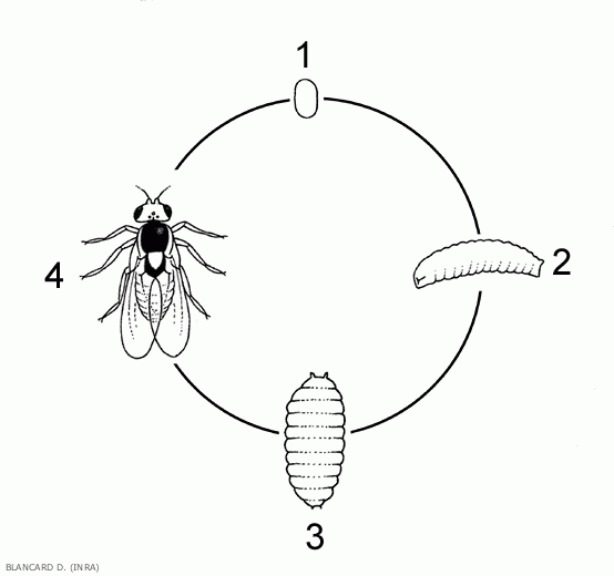 - Etapas de desarrollo : los huevos (figura 4-1), de color crema y forma ovalada (los de Liriomyza bryoniae miden 0,12 x 0,27 mm), se depositan en los tejidos durante las picaduras de puesta con el uso de la hembra. oviscapto. Una hembra puede producir varios cientos de huevos que posteriormente eclosionan y dan a luz larvas transparentes de 0,5 mm de largo (Figura 4-2) (Figura 5). Estos cavan galerías en los folletos que la presencia de excrementos negros hace claramente visibles. Las larvas blancas del tercer estadio de 2,5 mm de largo perforan la hoja, dejan los folíolos, caen en pliegues de plástico o en el suelo y se entierran poco a poco. Posteriormente, se transforman en pupas (Figura 4-3) con forma de barril y cuyo color varía a medida que envejecen desde el amarillo al marrón oscuro (Figura 6), siendo las pupas negruzcas las que suelen ser parasitadas. La pupación de Chromatomyia horticola tiene lugar en la hoja: el pupario, cubierto por la epidermis de la hoja, es entonces visible en forma de una pequeña protuberancia al final de la galería larvaria. Los adultos (Figura 4-4) son pequeñas moscas de 2 a 3 mm de largo, amarillas y negras ( Liriomyza spp., 7) o gris oscuro (C hromatomyia horticola ). Las hembras adultas, presentes en la superficie superior del limbo, perforan la epidermis gracias a la verdadera barrena que es su ovipositor, chupan el jugo de la verdura (bocado nutritivo) y depositan sus huevos (bocados de puesta de huevos). Tenga en cuenta que los machos, desprovistos de barrenas, también aprovechan las picaduras para alimentarse.