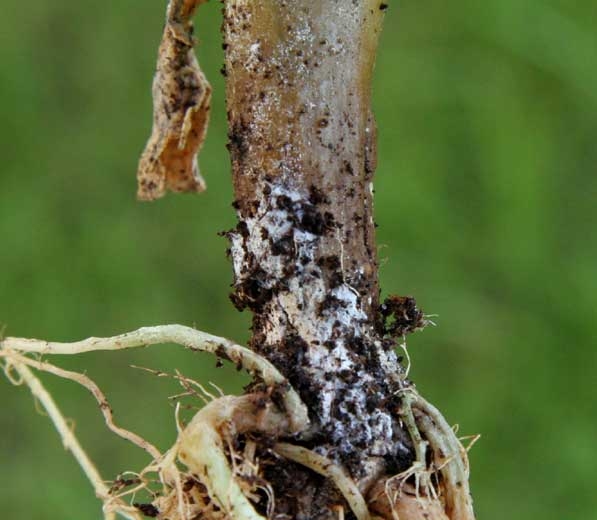 La porción del tallo cerca de la superficie del suelo está cubierta por un micelio de color blanco a rosado (Figura 4) en el que se forman los esporodoquios y macroconidios de este Fusarium .