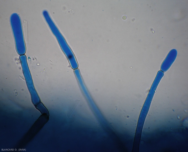 Se mantiene fácilmente en los restos de plantas durante más de 2 años. La contaminación se produce durante los períodos húmedos, a través de los estomas o directamente a través de la cutícula. Una vez en los tejidos, el hongo los coloniza rápidamente y esporula sobre los tejidos alterados (Figura 1), formando característicos conidios alargados subhialinos a ligeramente marrones, aislados o en cadena corta (Figura 2).